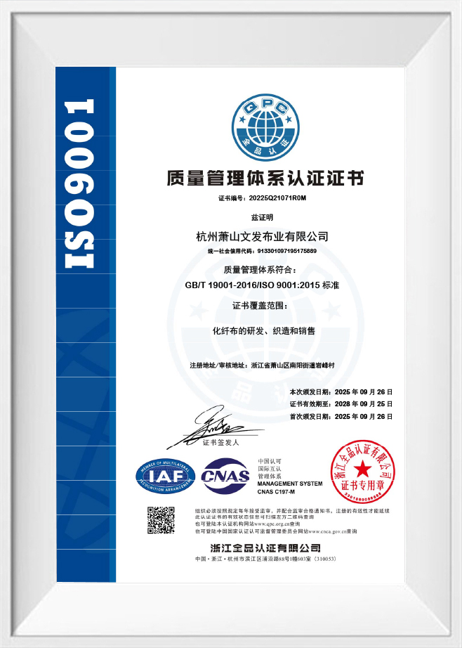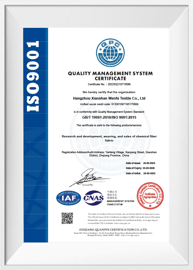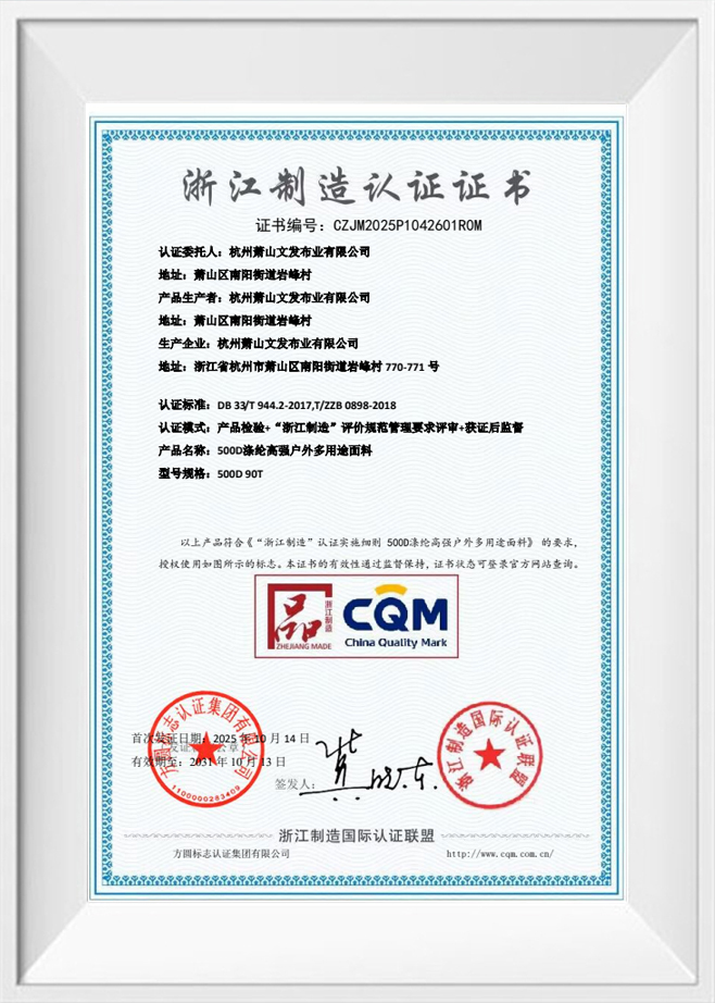 Wenfa Textile on ISO-sertifioitu ja täyttää maailmanlaajuiset standardit, kuten REACH, GRS ja OBP, mikä varmistaa, että niiden kankaat täyttävät tiukat laatu- ja kestävyysvaatimukset. Heidän sitoutumisensa laatuun ja innovatiivisuuteen tekee niistä ensisijaisen vaihtoehdon yrityksille eri aloilla, mukaan lukien matkatavarat, ulkoiluvarusteet ja lasten tuotteet.